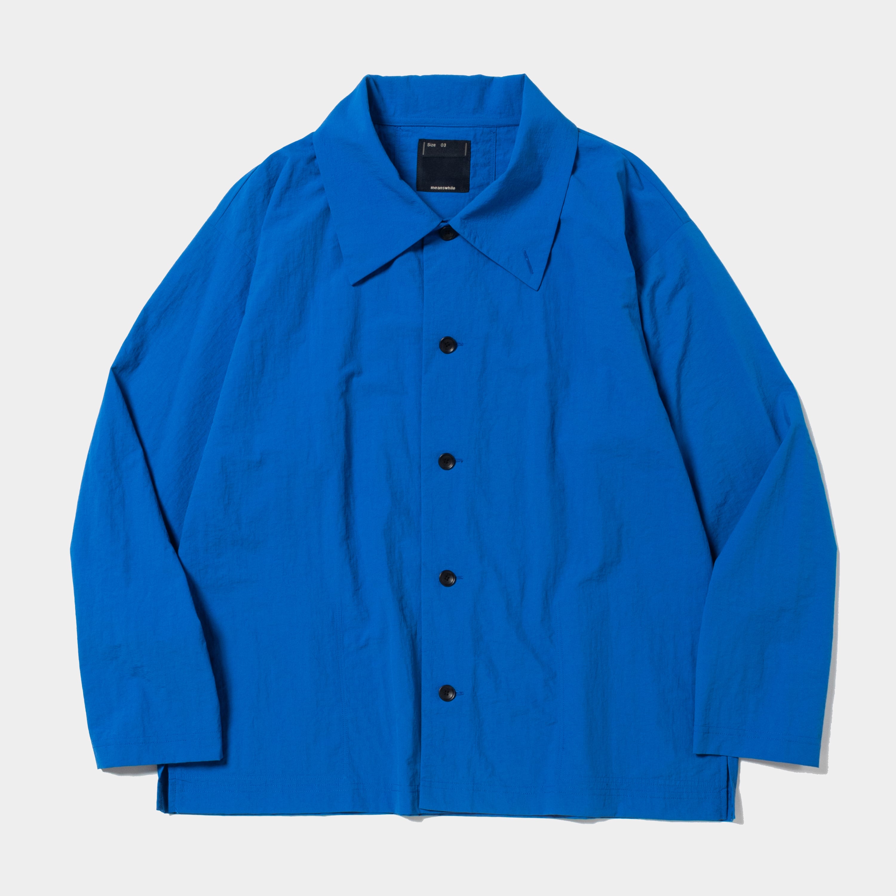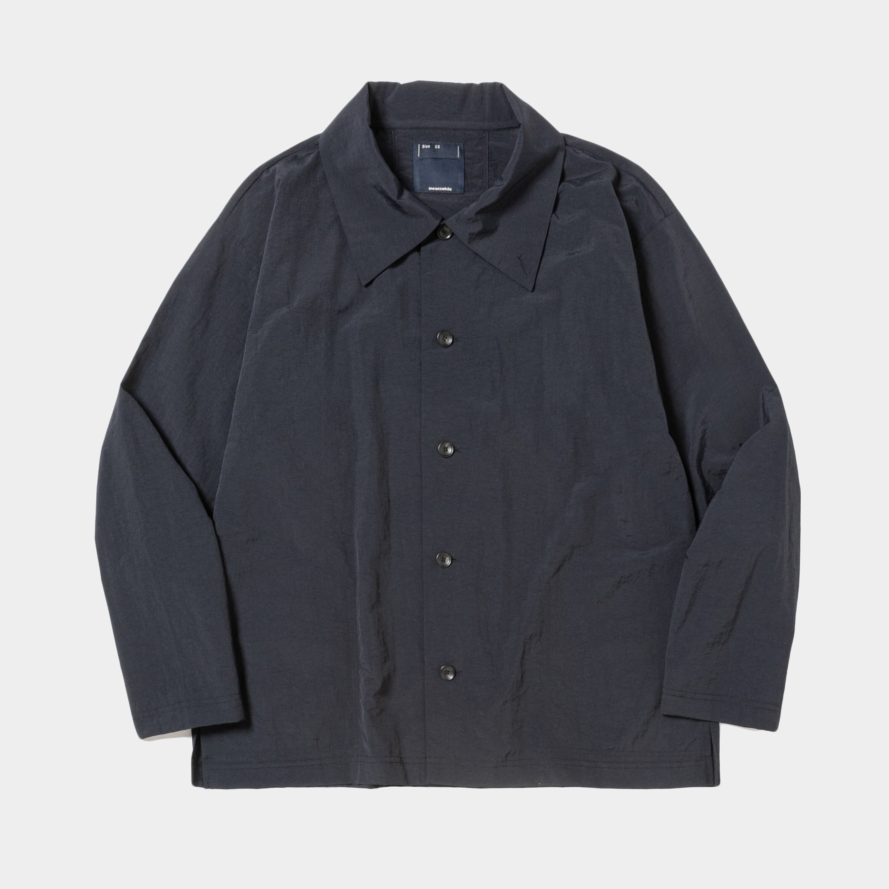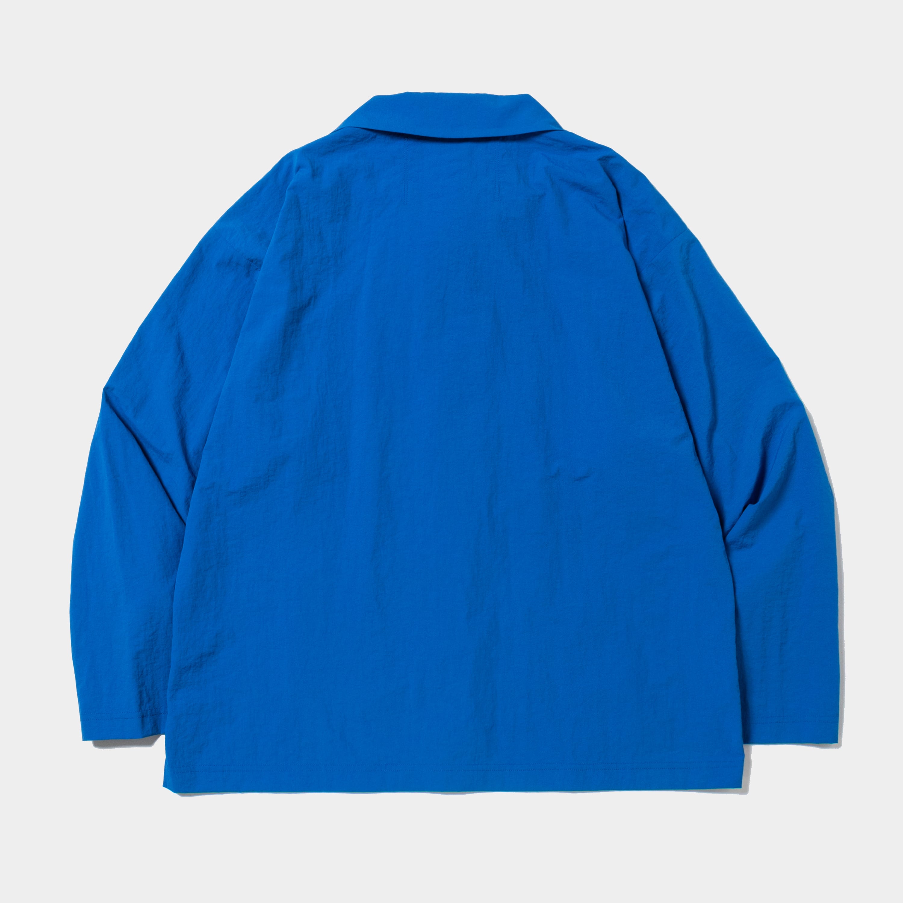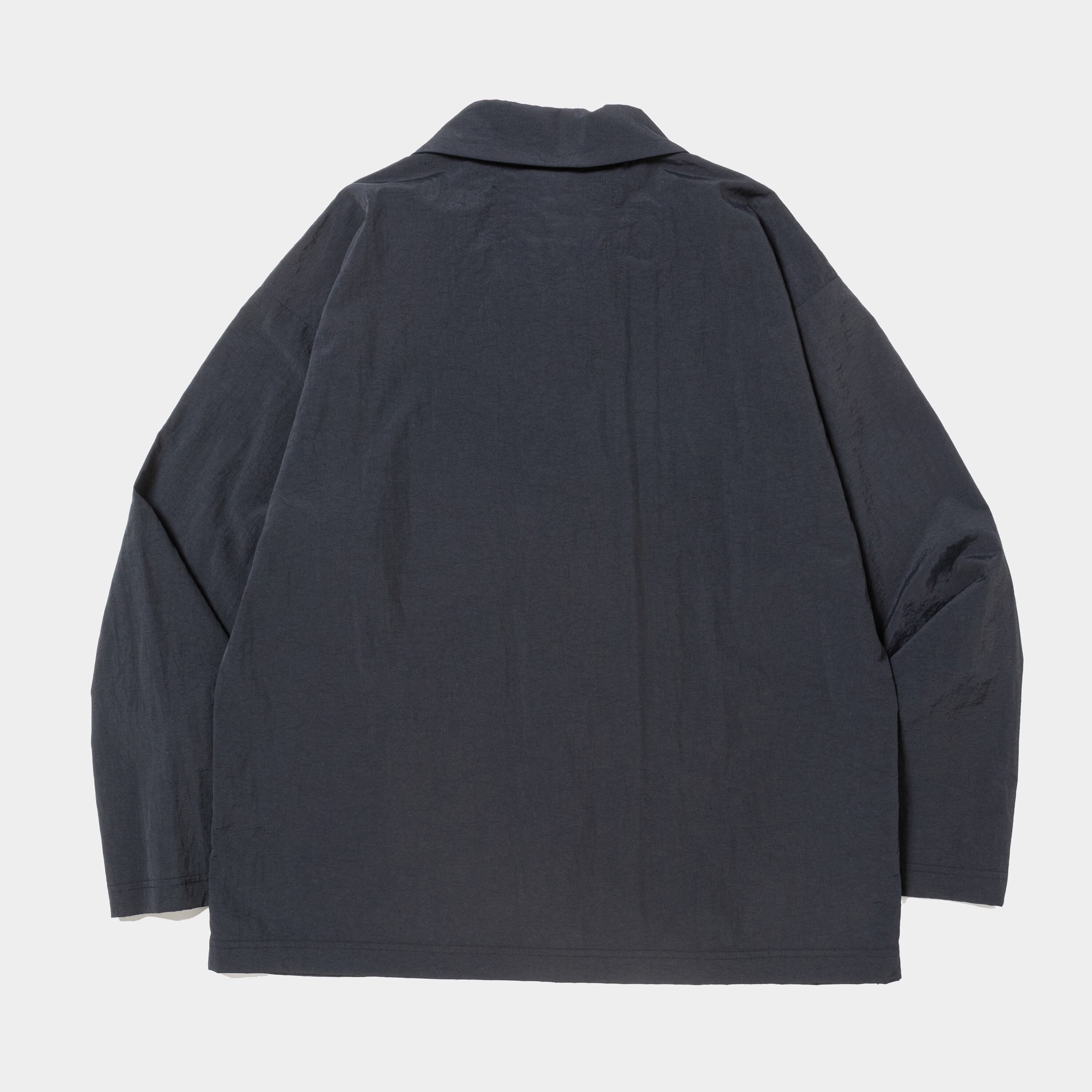 ナイロンタスランタフタを使用したカバーオール。大きめの衿やボリュームのある袖、たっぷりとゆとりを入れた身頃等、アウターとしても着用できるシルエットが特徴。身頃を切り込んだ様な袖付け線がアクセントに。衿はスタンドカラーとしても着用可能。