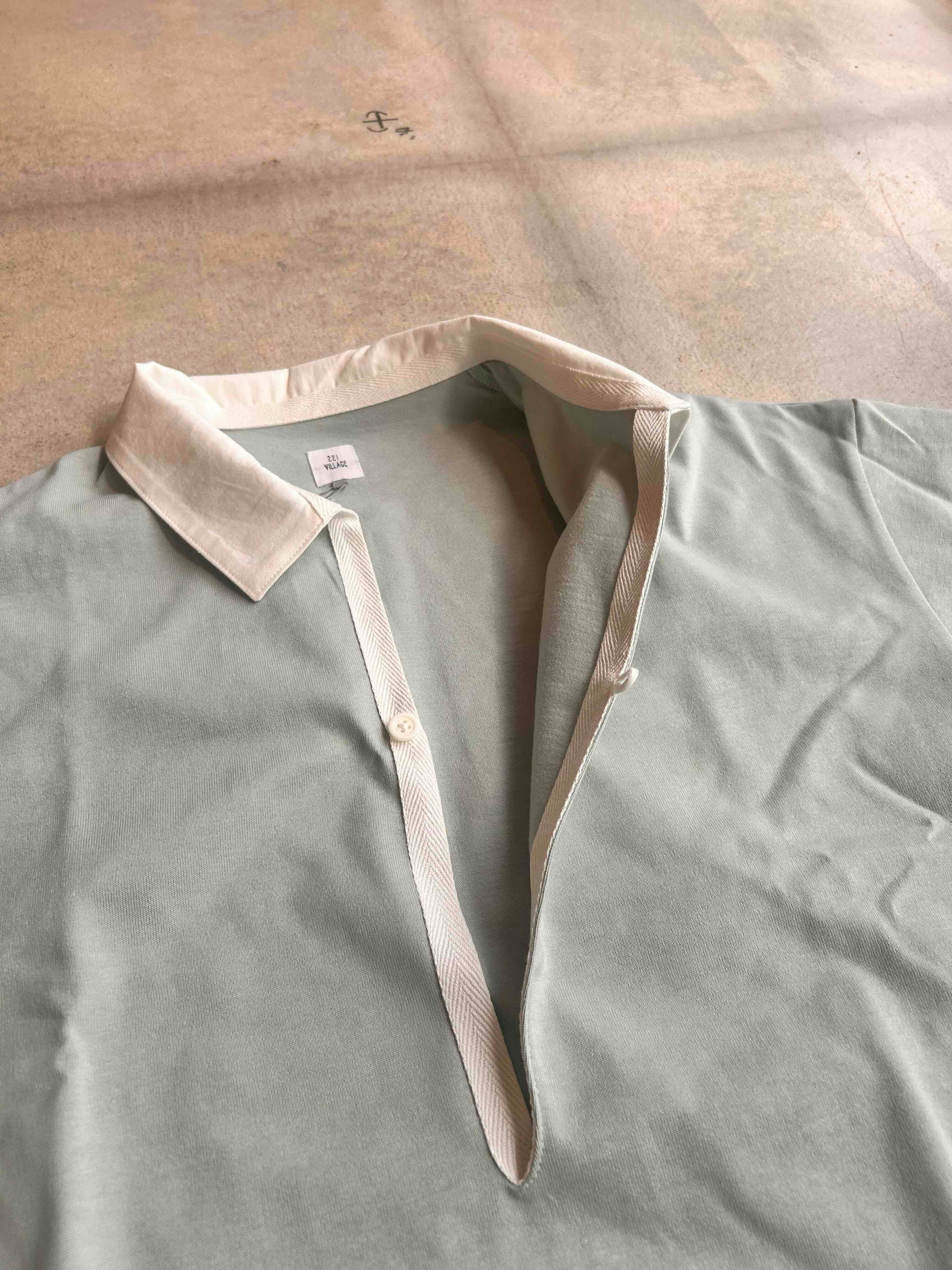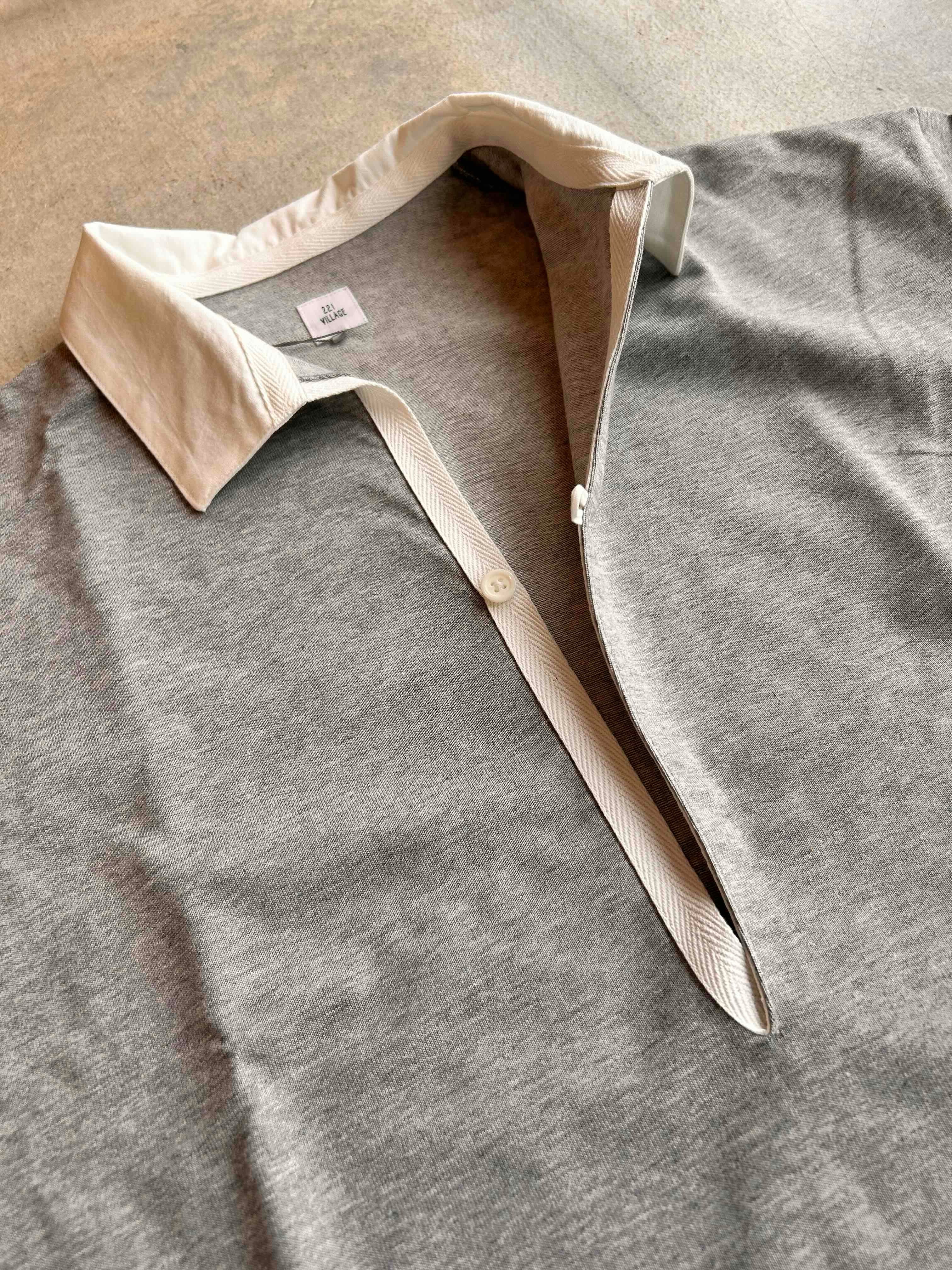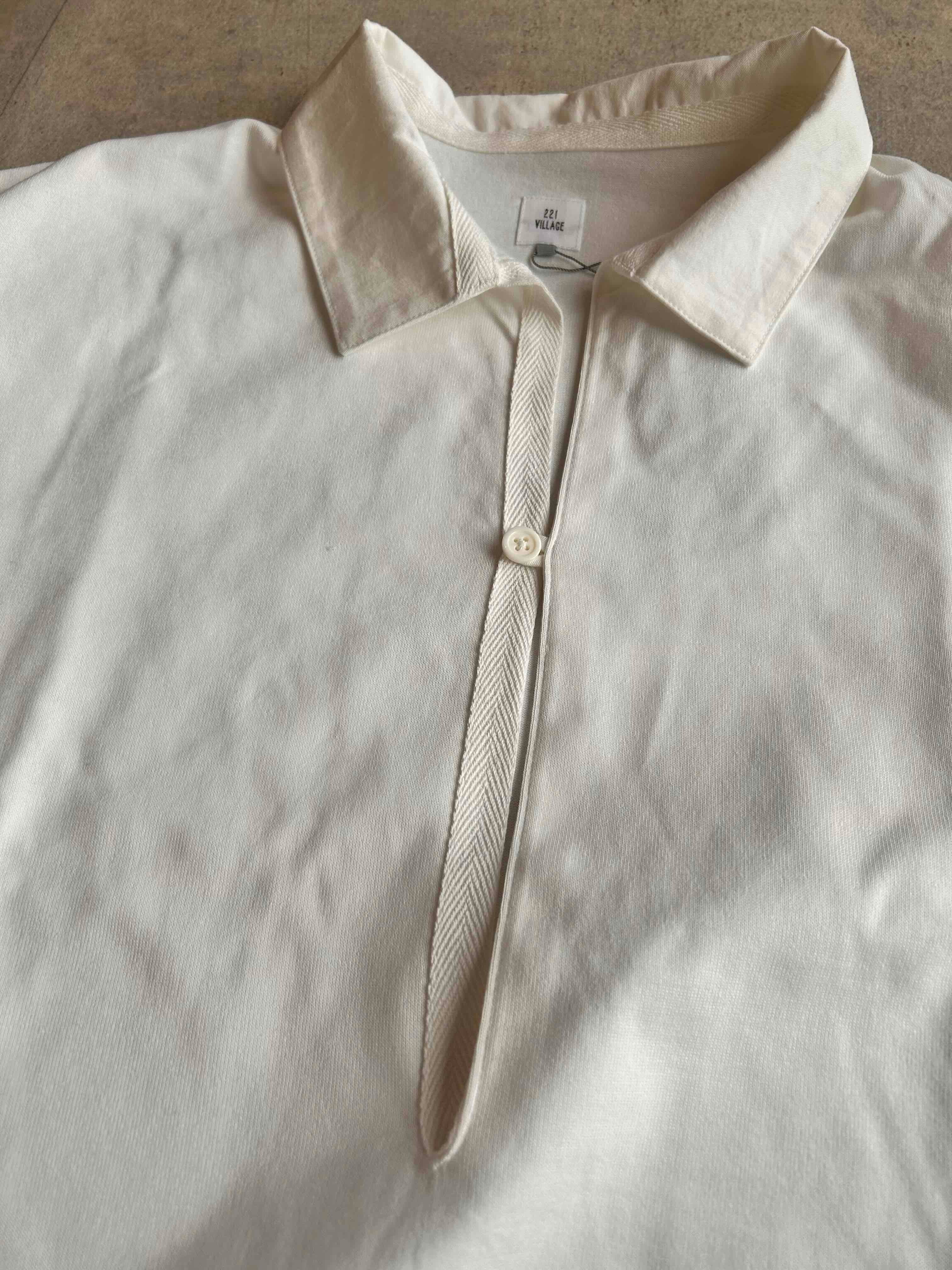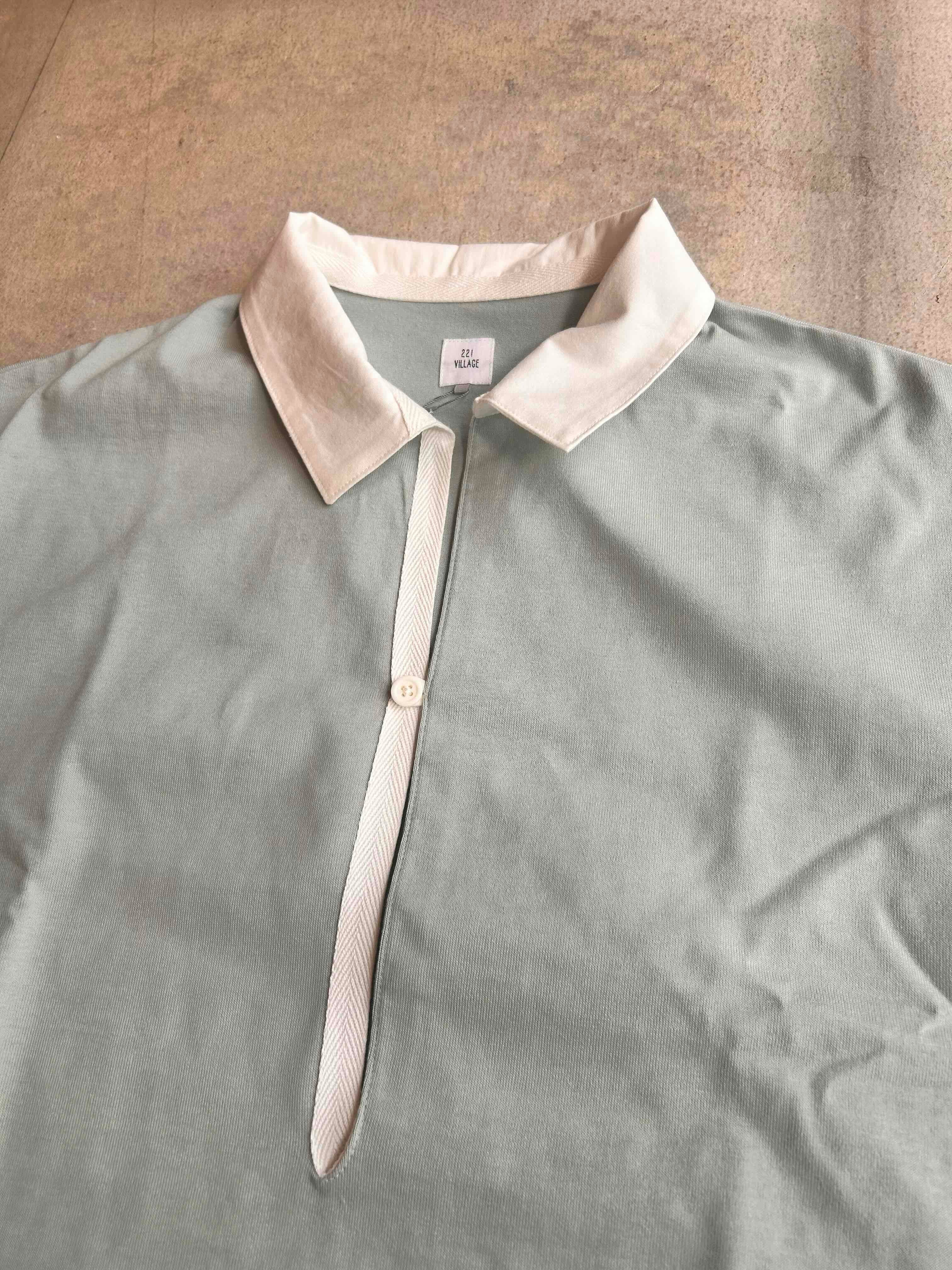 ハリのあるジャージー素材でラガーシャツをイメージさせる衿のデザイン。