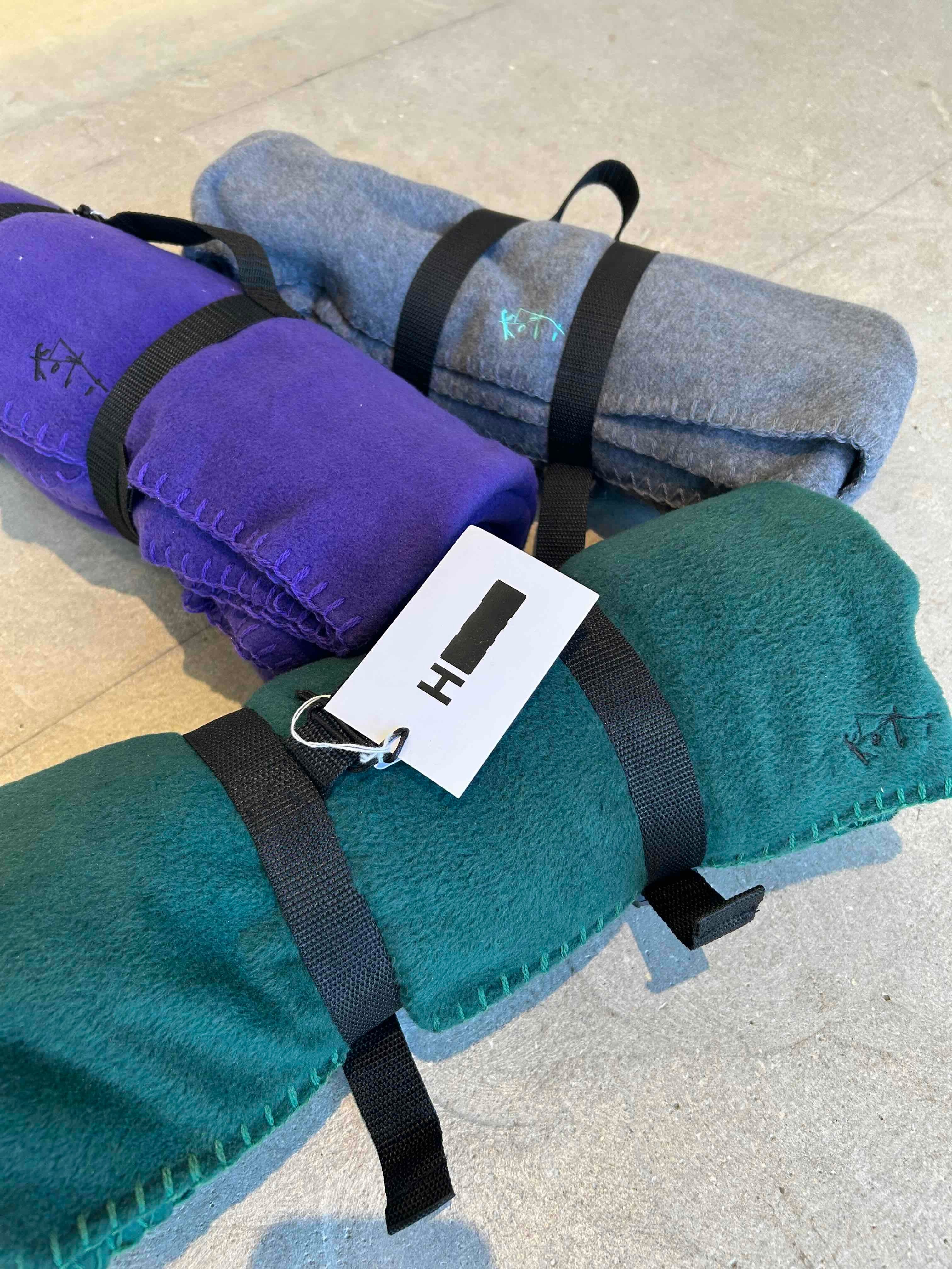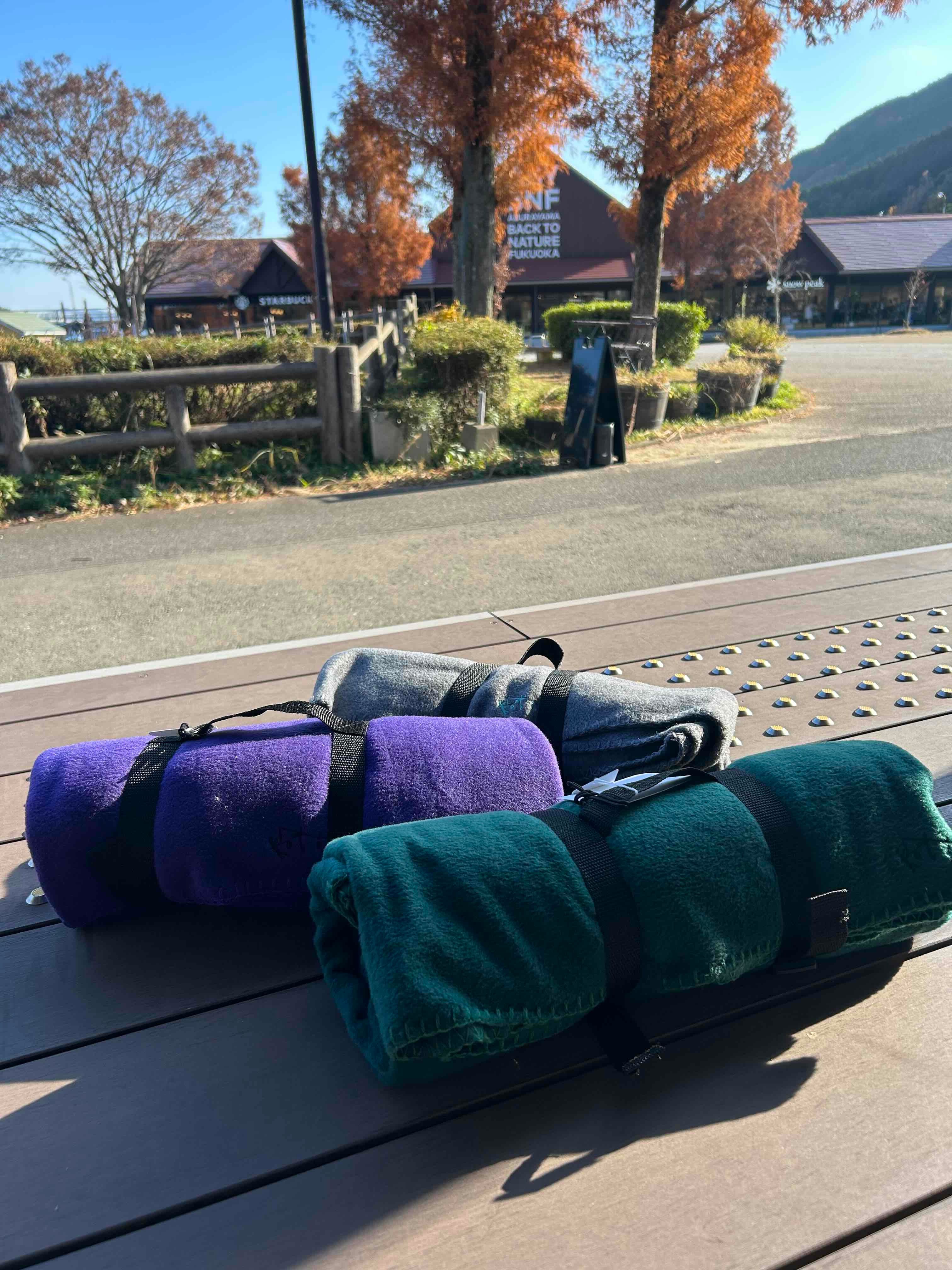 持ち運びに便利なストラップ付き。これからの季節、膝掛けや羽織ったりフィールドからリビングまで活躍してくれるアイテムです。