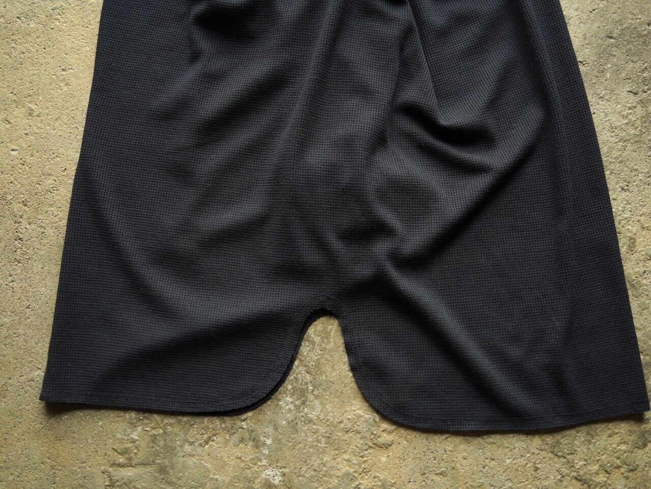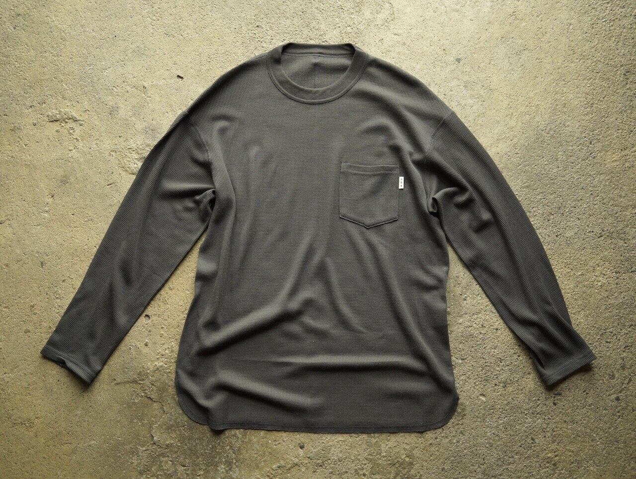 ポリエステルフィラメント(クールマックス)をウールの繊維束で包み込み、交撚するIN-SPIRAL SPIN製法による偏芯螺旋構造の糸で編み上げた、ウールの着心地の良さと、ウール100%の生地に比べ摩擦に強く、毛玉になりにくく、洗濯しても縮みが少ない、気を使うことなくヘビーに着用できる、まさにHIKERのための糸AXIOを使用してワッフル編みされた生地を使ったサーマルLong sleeve teeです。